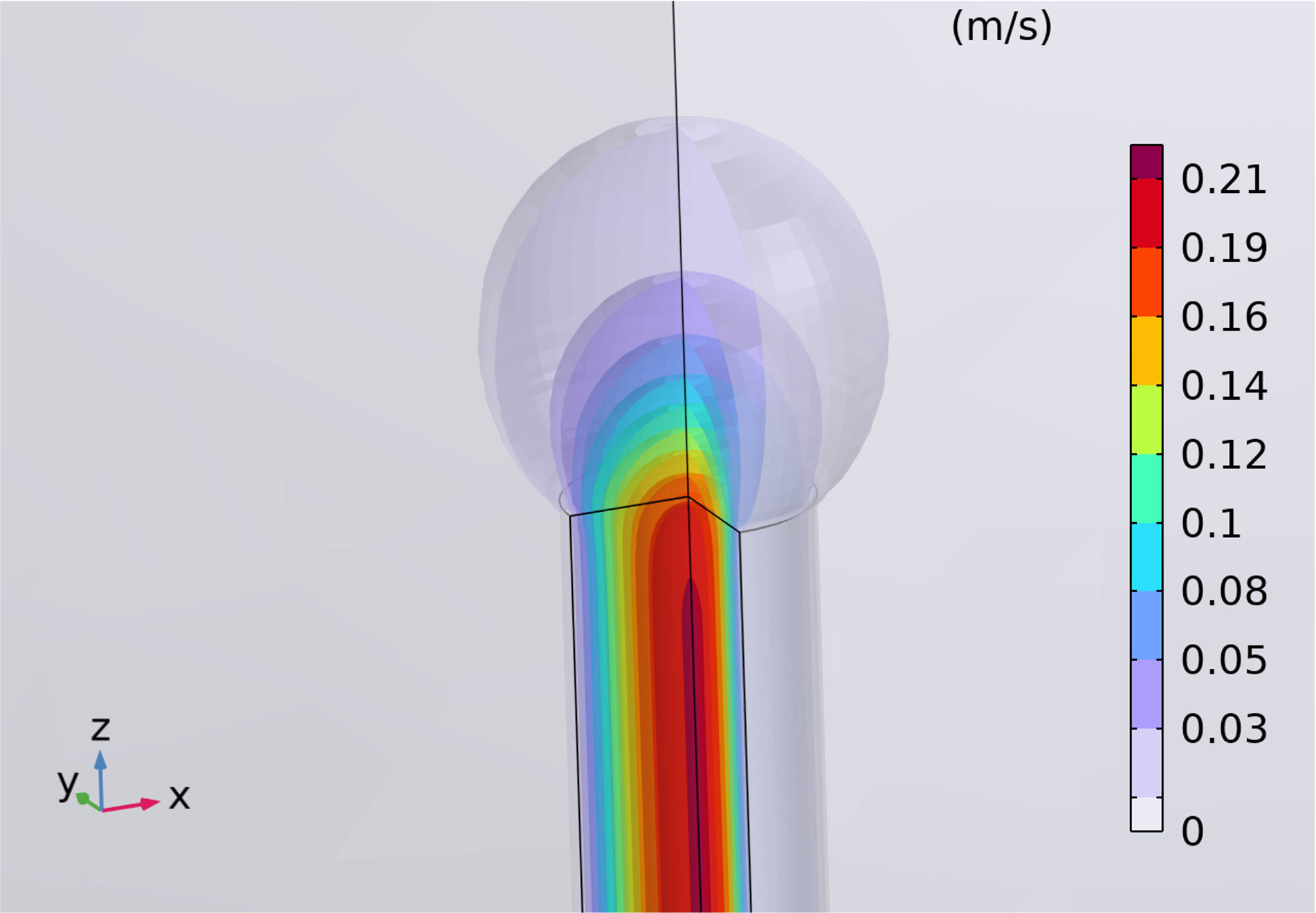 "In professional audio and hearing aid technology, lumped element models are often used as a quick and convenient tool to predict the behavior of audio transducers, such as MEMS microphones. To increase the accuracy of these models, end corrections for a spout or sound inlet, need to be included on the acoustic channel length. These end corrections describe how an acoustic channel is open to the outside environment, such as a channel with an open end or a channel that ends with an opening in the infinite plane, called a baffle. The coefficients that reflect the end correction to the acoustic mass of the spout or inlet are well known. The end correction coefficient for the real part of the acoustic impedance, which corresponds to the channel's acoustic resistance, is typically assumed to be the same as that for acoustic mass. In our study, we used thermoviscous acoustics in COMSOL to introduce and quantify the end correction for acoustic resistance. By doing so, we found that the end correction for acoustic mass can be different from that used for acoustic resistance." (Figure 4)