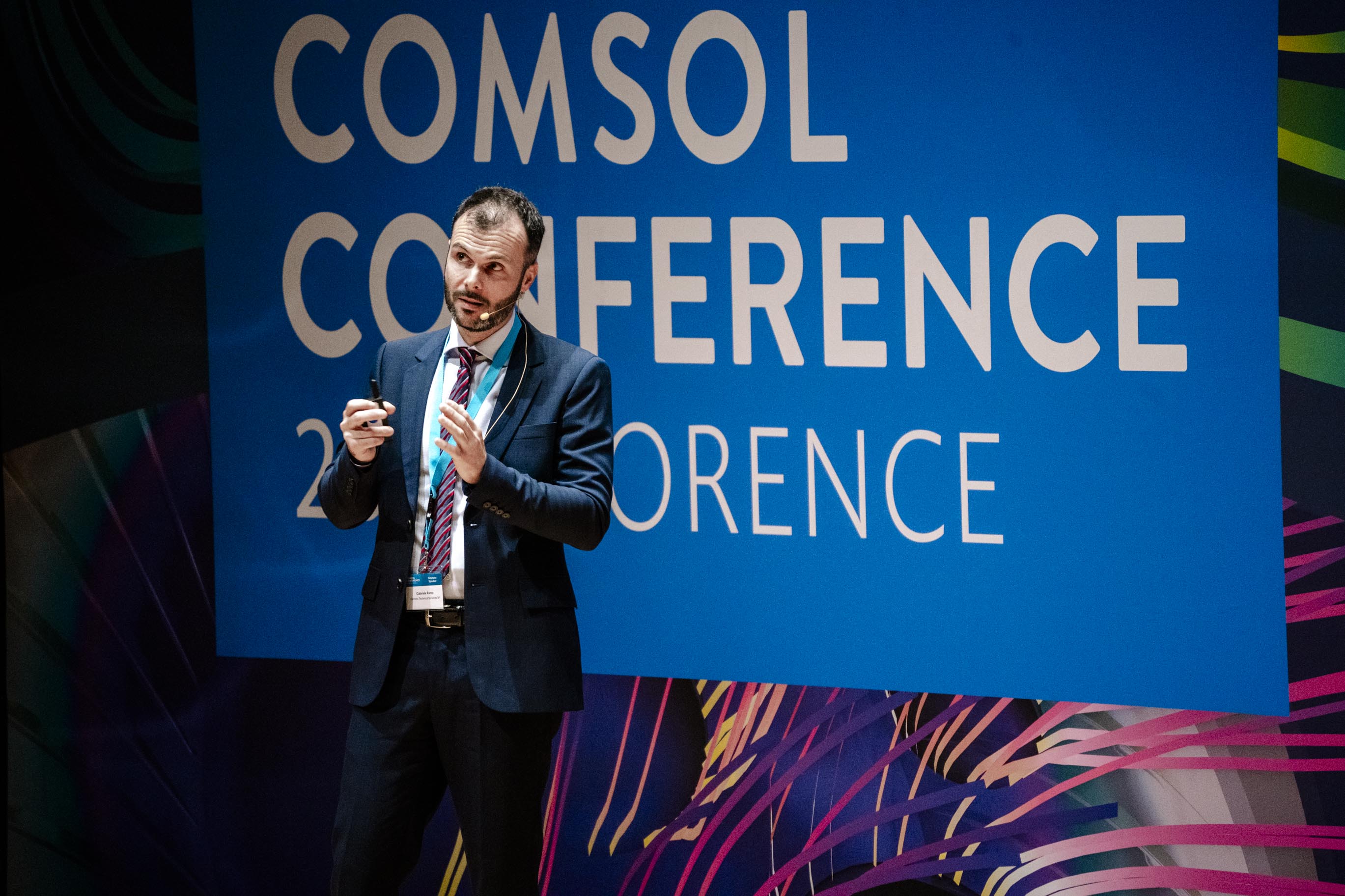 Another highlight of the COMSOL Conference 2024 Florence was the invited talk sessions, which were dedicated to specific industries and areas of physics and featured presentations by invited authors. During these sessions, four speakers each delivered 10-minute slideshow presentations on how they are using modeling and simulation. With a total of 48 invited talks, attendees were able to see how simulation is being used for applications such as noise attenuation, machine learning, and spacecraft device development, to name just a few.